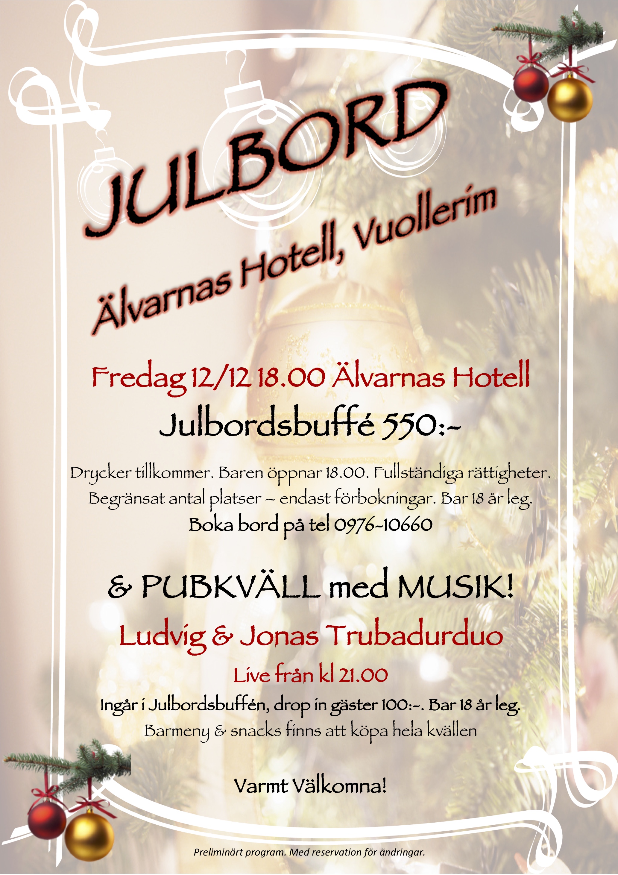 VIVA is happy to tailor events, dinners, memorial services, conferences, and celebrations. Let us create a proposal together based on your ideas! Feel free to contact us through the form next to this text. For more information and questions, contact the reception at Hotell Vuollerim by phone at +46 976-10660 or email info@hotellvuollerim.se.